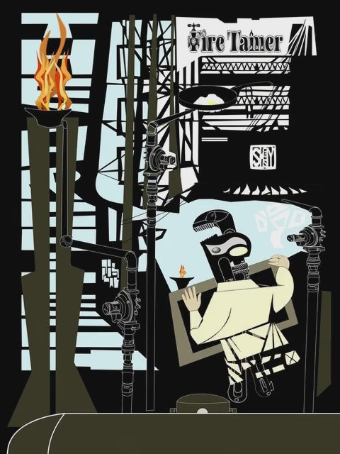 Ignite your wardrobe with The Contractor Series: Fire Tamer, a blazing triumph from Shoosty's acclaimed 2022 Contractors collection. This comic-book-inspired guardian—helmeted in black, wielding torch and hose like a mythic conqueror—tames the primal fury of flame amid towering pipes and industrial chaos, rendered in stark blacks, fiery oranges, and dramatic contrasts that evoke the raw power of civilization's oldest force. Echoing the brooding intensity of Marvel's Ghost Rider—that flaming-skulled anti-hero who commands infernal fire with unyielding resolve—this "Fire Tamer" stands as the ultimate gas contractor superhero, mastering the element that forged humanity itself.